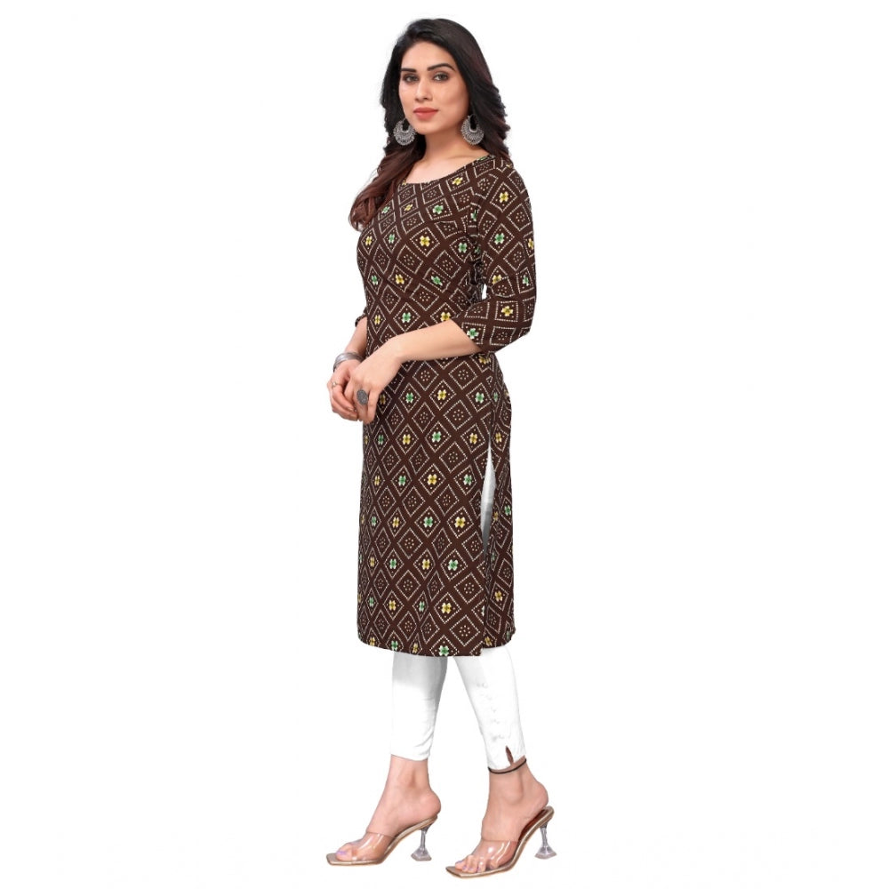 Women's Casual 3/4th Sleeve Bandhani Printed Crepe Kurti, • Color: Brown, • Material: Crepe, • Pattern: Bandhani Printed, • Kurti Type: Straight, • Kurti Length Type: Knee Length, • Neck Type: Round Neck, • Sleeve Length: 3/4 Sleeve, • Gender: Women, • Disclaimer: The color of actual product may vary slightly from the images provided due to photographic lighting conditions and difference in screen resolutions.