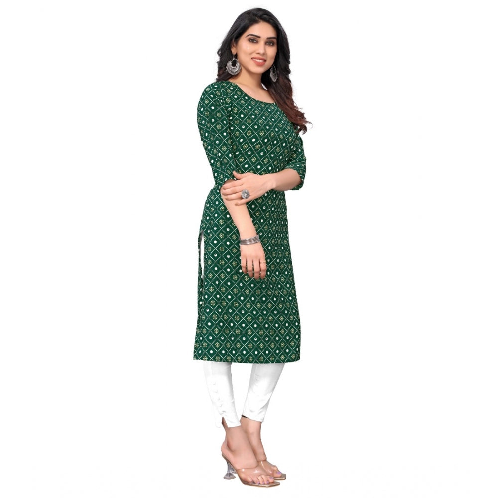Women's Casual 3/4th Sleeve Bandhani Printed Crepe Kurti, • Color: Dark Green, • Material: Crepe, • Pattern: Bandhani Printed, • Kurti Type: Straight, • Kurti Length Type: Knee Length, • Neck Type: Round Neck, • Sleeve Length: 3/4 Sleeve, • Gender: Women, • Disclaimer: The color of actual product may vary slightly from the images provided due to photographic lighting conditions and difference in screen resolutions.