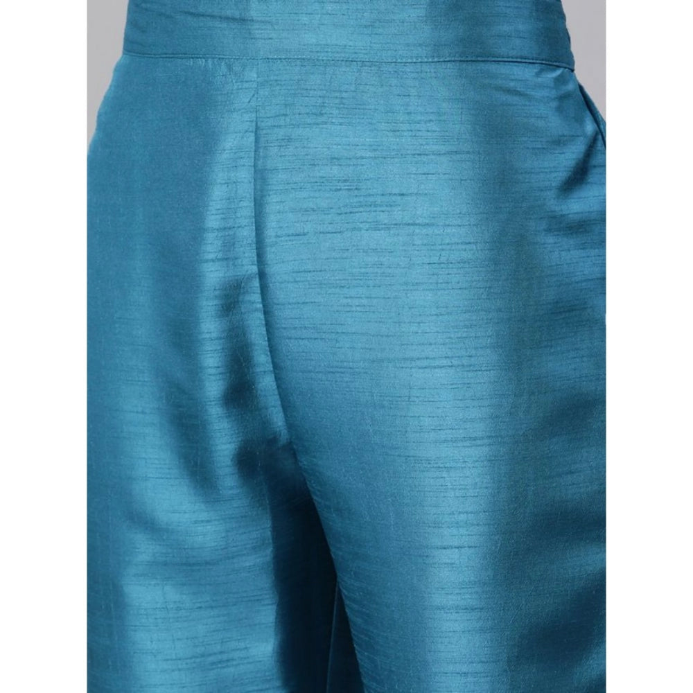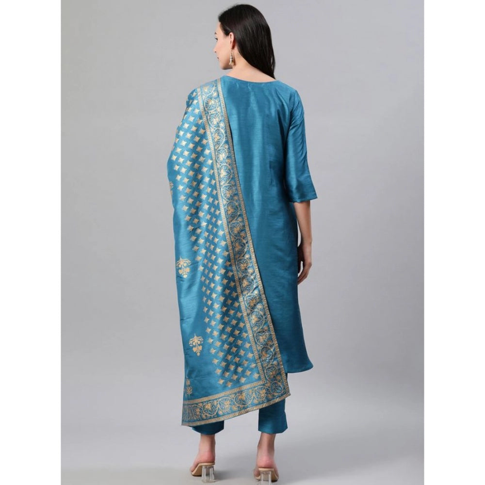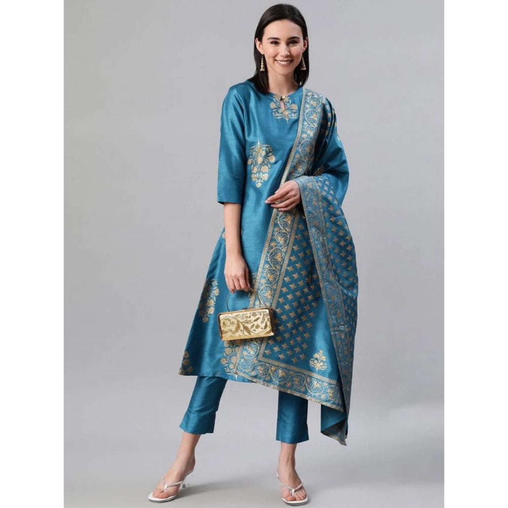 Amfyn Women's Casual 3-4Th Sleeve Ethnic Motifs Poly Silk Kurti Pant And Dupatta Set (Blue)