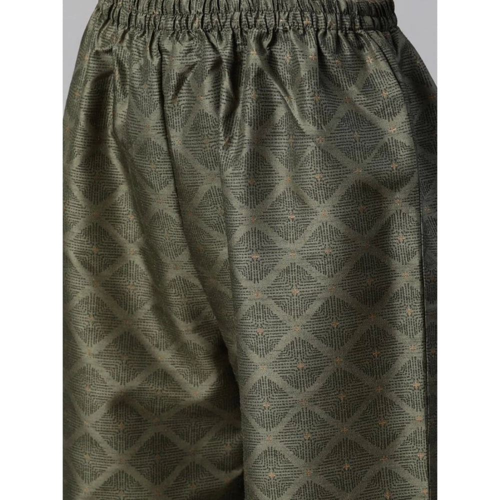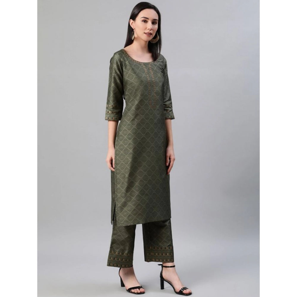 Amfyn Women's Casual 3-4Th Sleeve Ethnic Motifs Poly Silk KurtiPalazzo And Dupatta Set (Green)