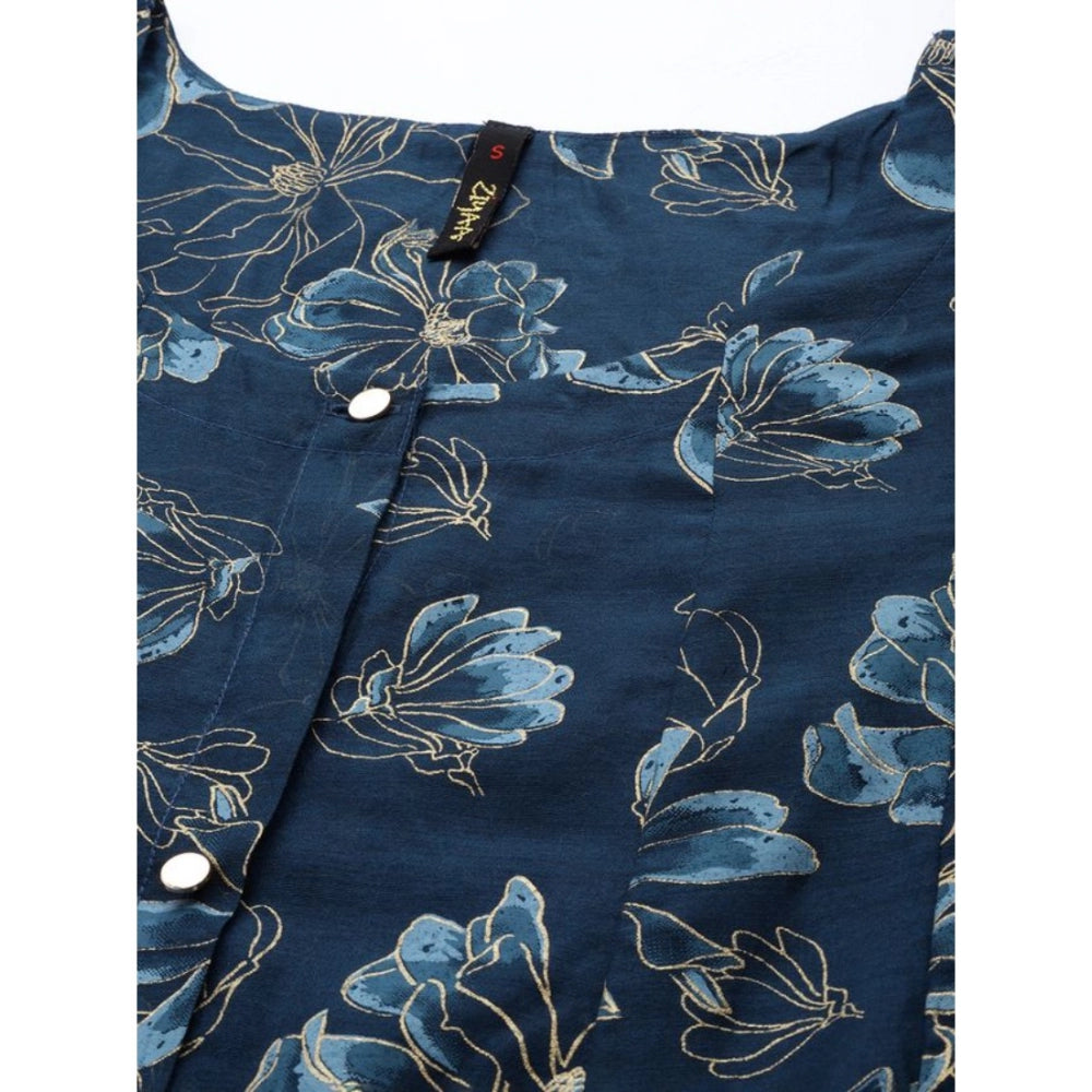 Amfyn Women's Casual 3-4Th Sleeve Floral Printed Chanderi Cotton Kurti And Pant Set (Navy Blue)