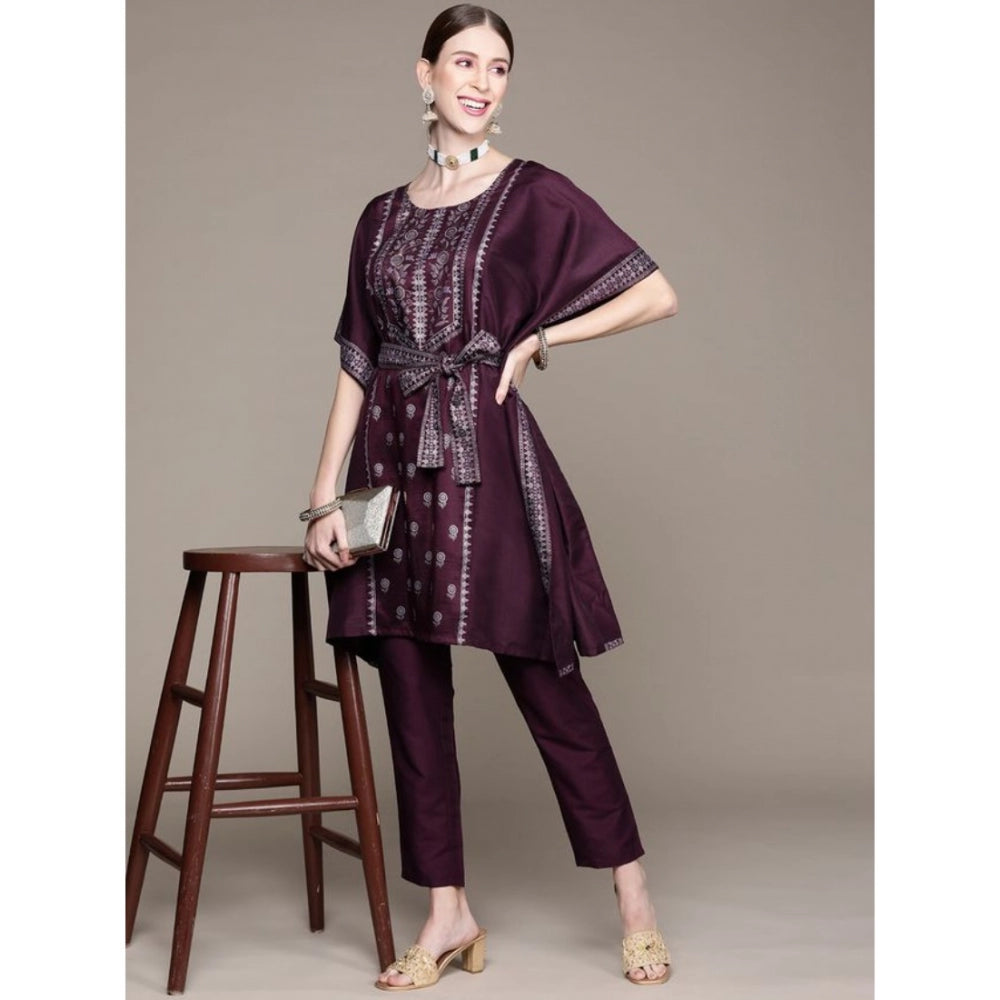 Amfyn Women's Casual 3-4Th Sleeve Floral Printed Chinon Kurti And Pant Set (Wine)
