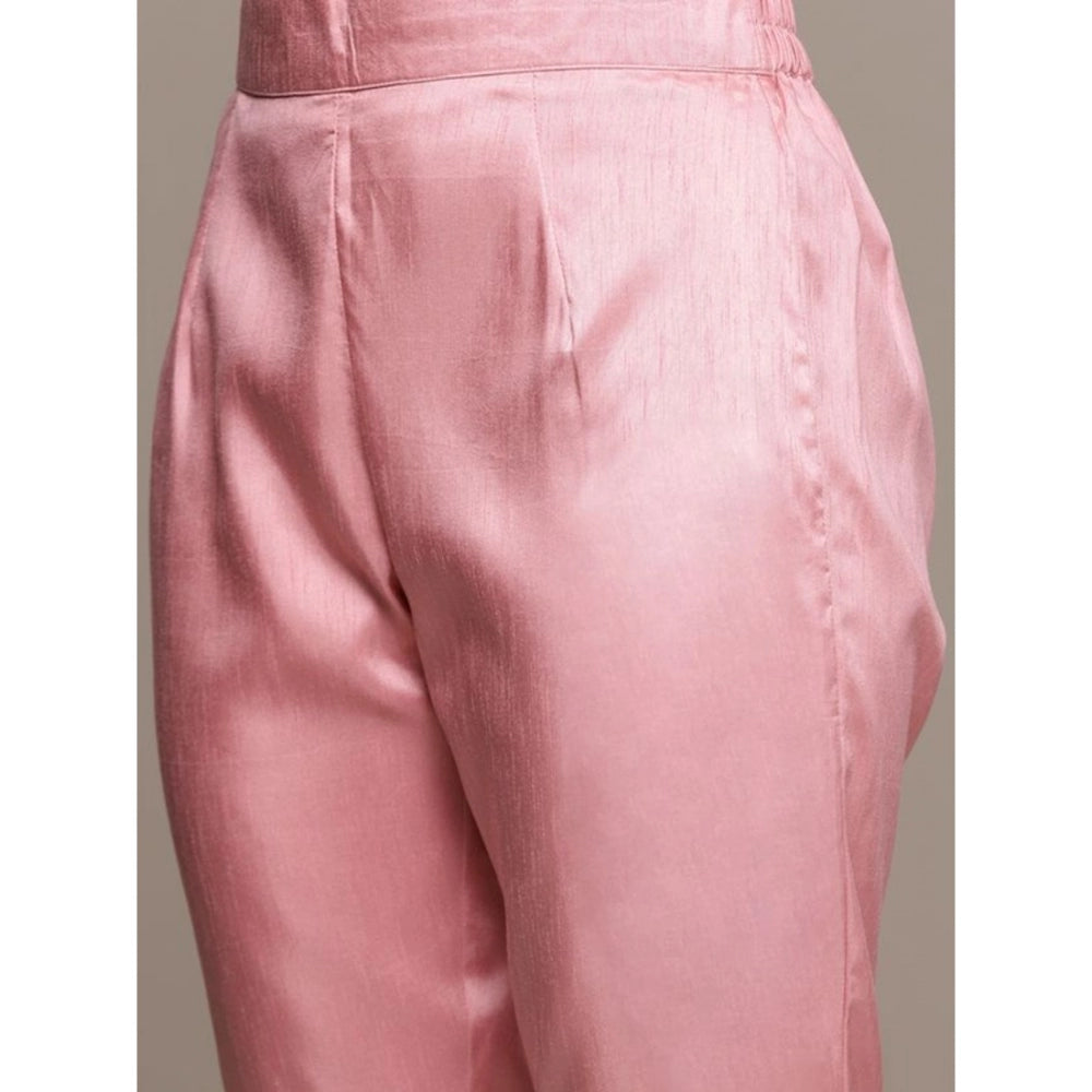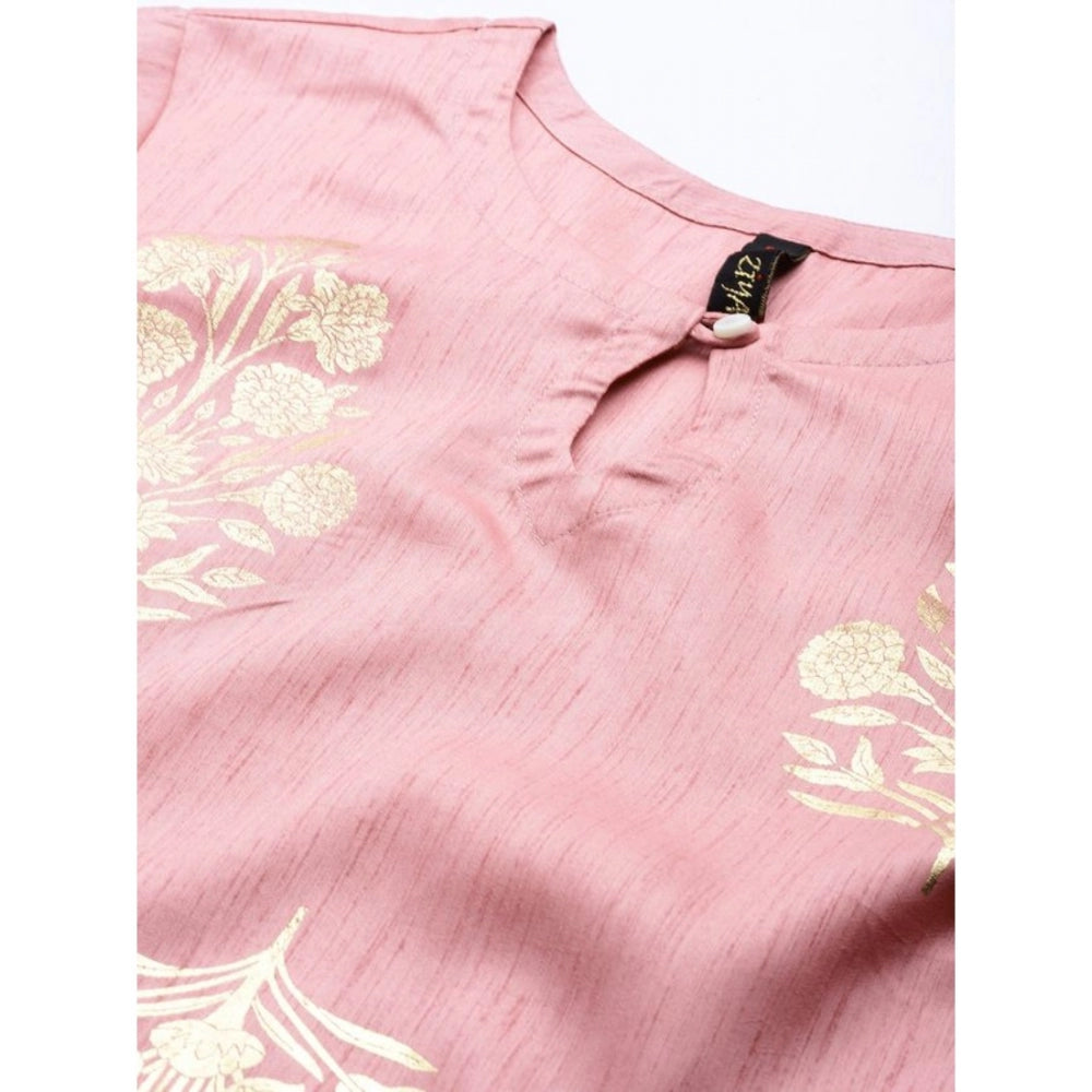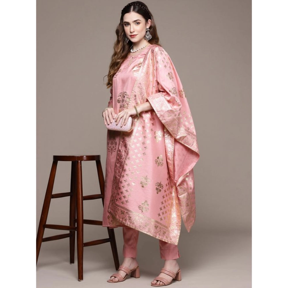 Amfyn Women's Casual 3-4Th Sleeve Floral Printed Poly Silk Kurti Pant And Dupatta Set (Light Pink)