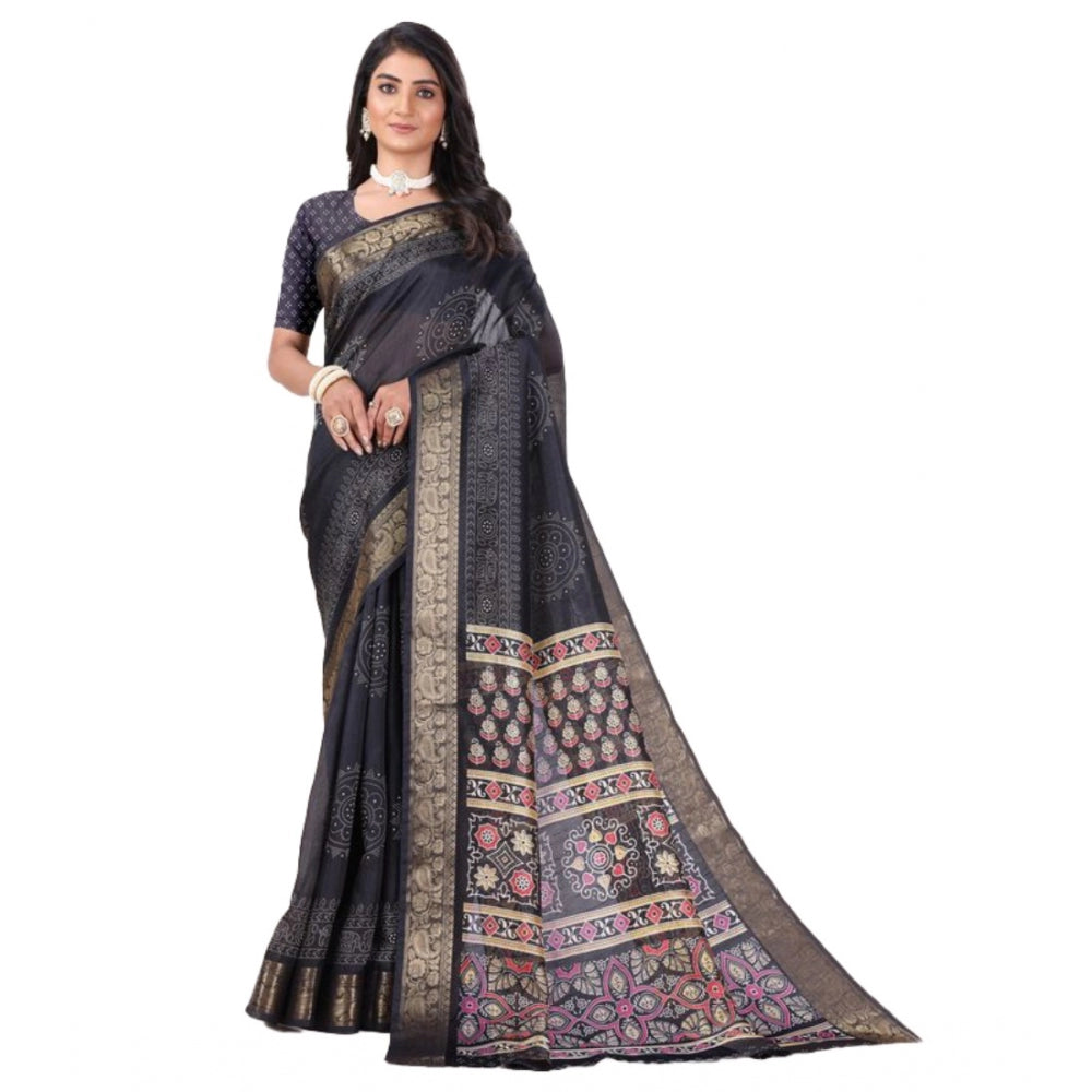 Amfyn Women's Cotton Printed Saree With Unstitched Blouse (Black, 5-5 Mtrs)