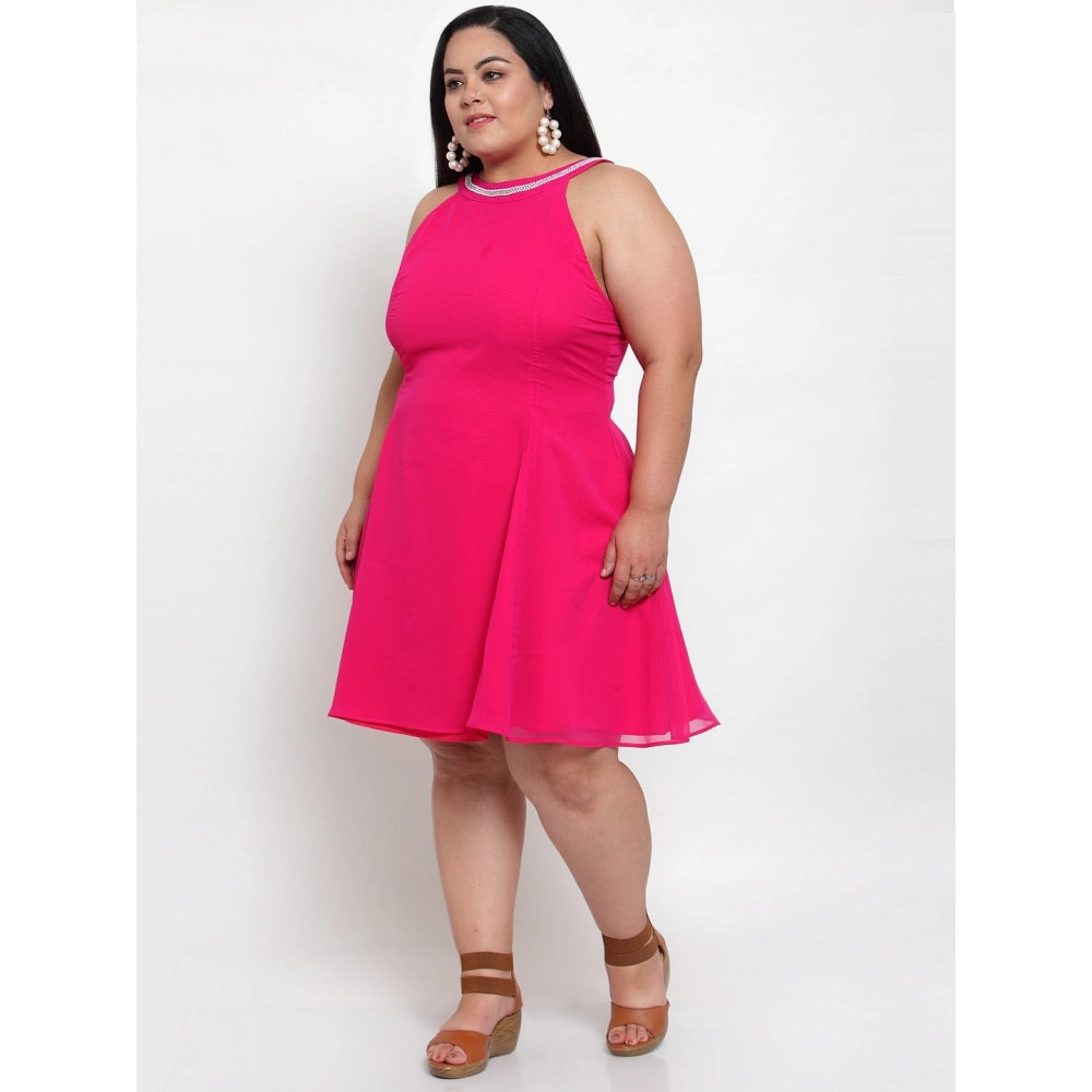 Amfyn Women's Georgette Solid Knee Length Fit and Flare Dress (Pink)