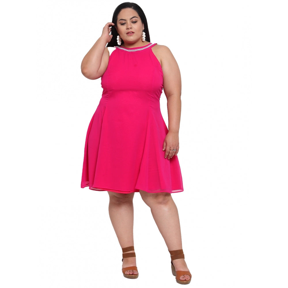 Women's Georgette Solid Knee Length Fit and Flare Dress (Pink)
