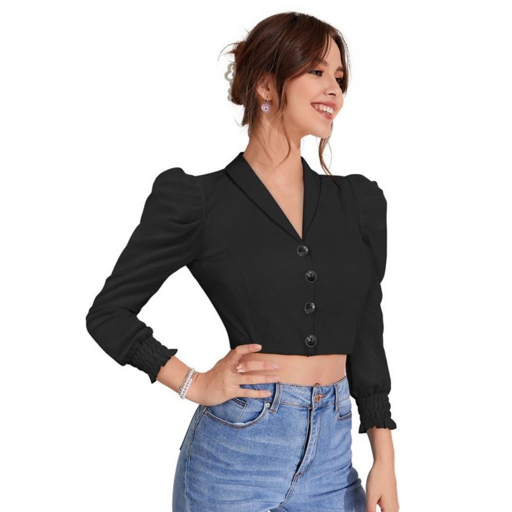 Amfyn Women's Polyester Solid Puff Sleeves Lapel Collar Top (Black)