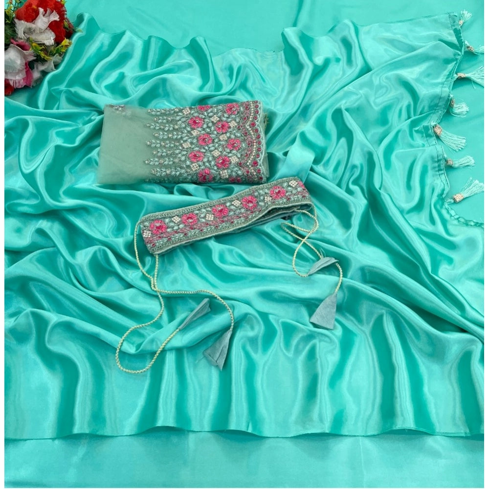 Amfyn Women's Satin Solid Saree With Unstitched Blouse (Skyblue, 5-5 Mtrs)