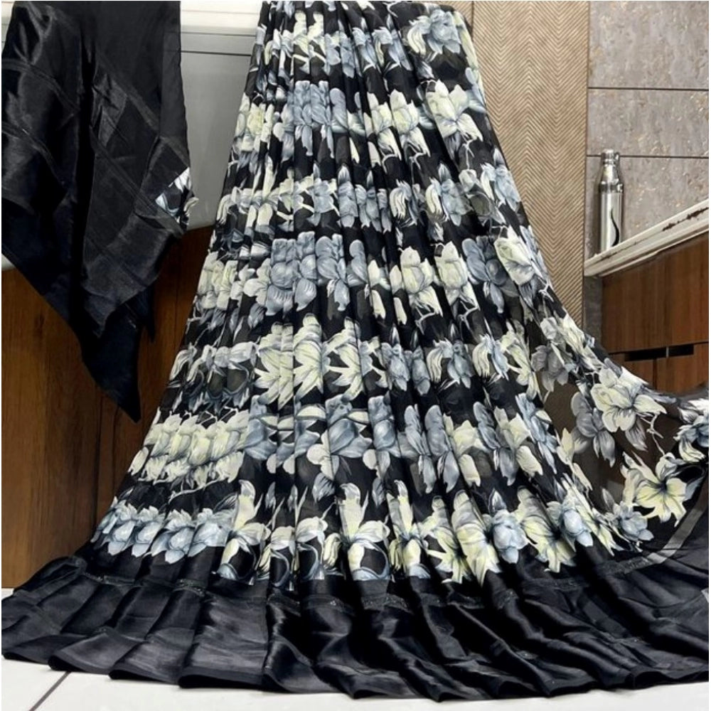 Women's Sattin Patta Printed Saree With Unstitched Blouse