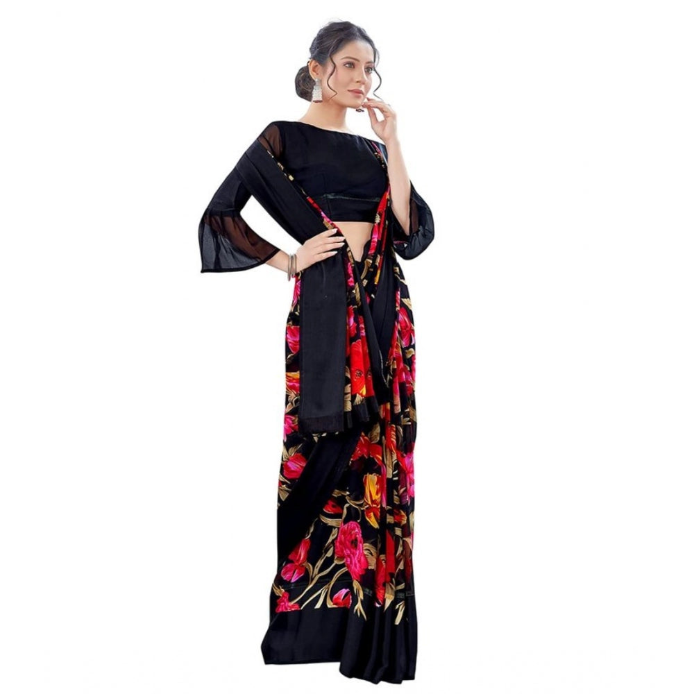 Amfyn Women's Sattin Patta Printed Saree With Unstitched Blouse (Black, 5-5 Mtrs)