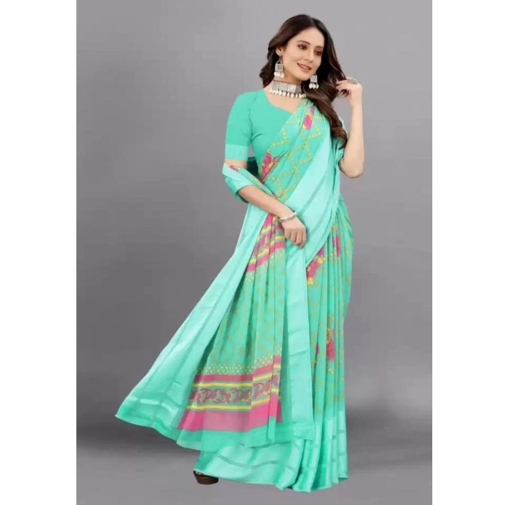 Amfyn Women's Sattin Patta Printed Saree With Unstitched Blouse (Green, 5-5 Mtrs)