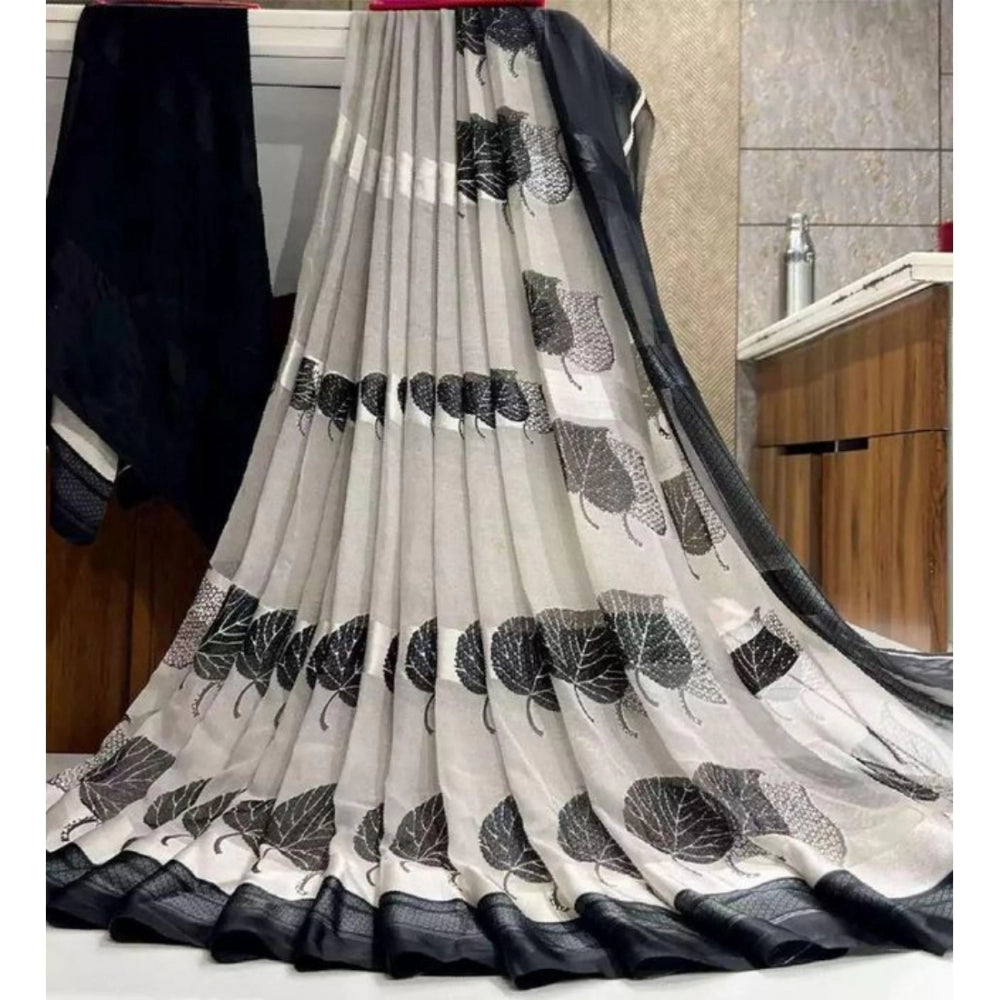 Amfyn Women's Sattin Patta Printed Saree With Unstitched Blouse (Grey, 5-5 Mtrs)