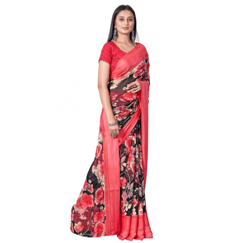 Amfyn Women's Sattin Patta Printed Saree With Unstitched Blouse (Red, 5-5 Mtrs)