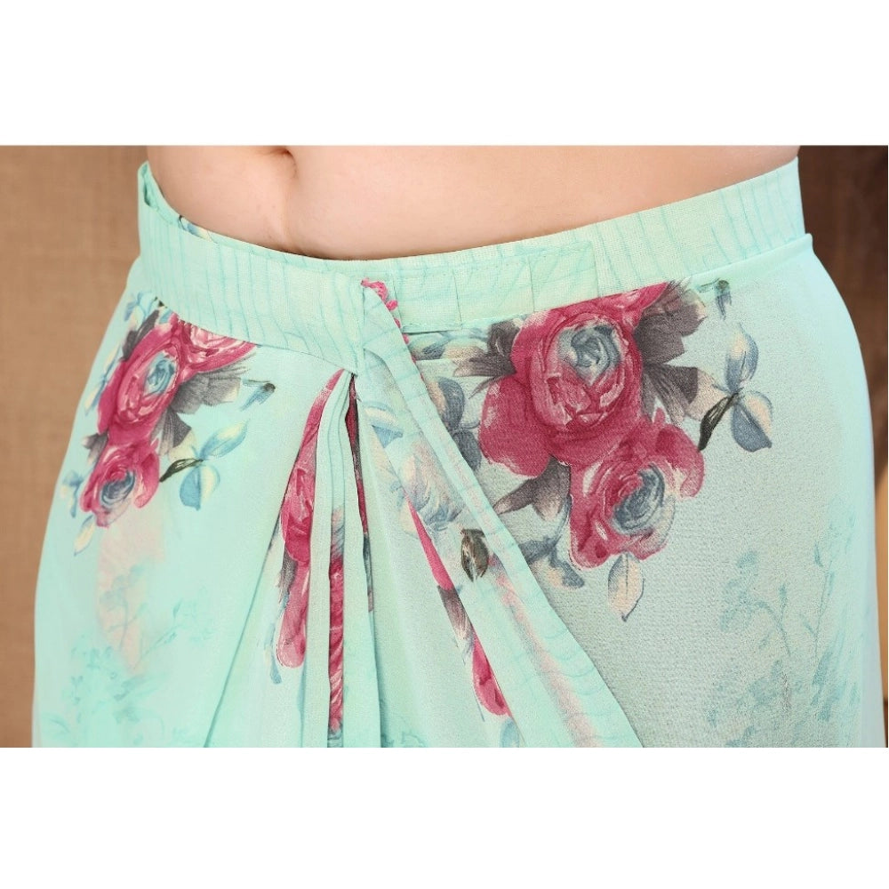 Amfyn Women's Small Lace Georgette Printed Ready-to-Wear Saree With Unstitched Blouse 5.5 Mtr (Turquoise)
