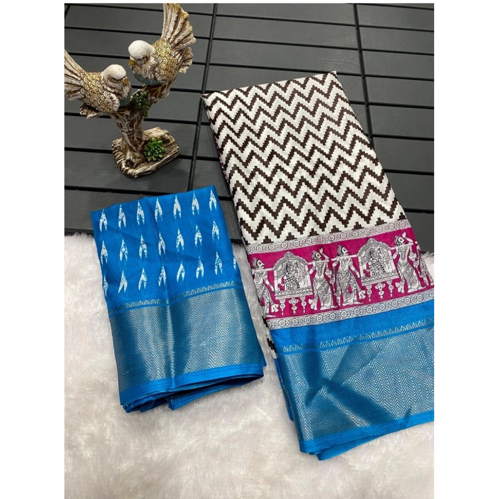 Amfyn Women's Soft Dola Cotton Kalamkari Printed Saree With Unstitched Blouse 5.5Mtr (Sky Blue)