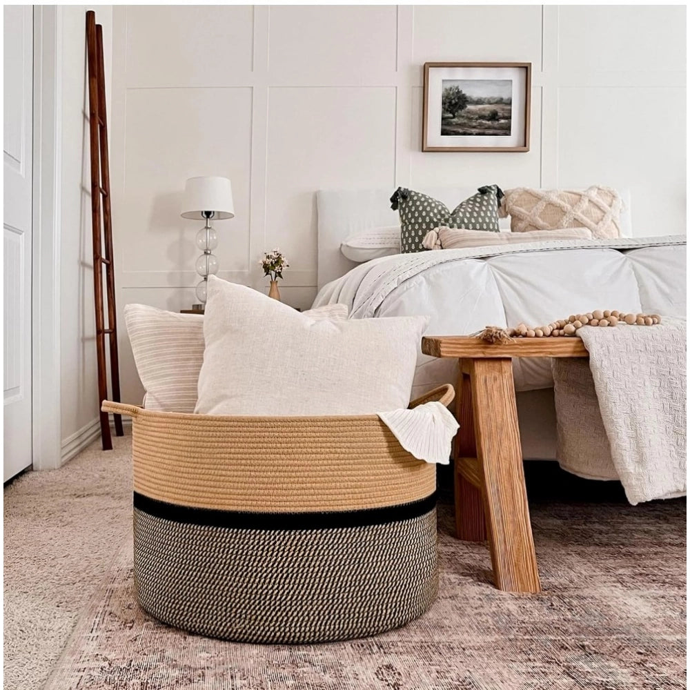 Amfyn Cotton Dori 16x14 Inch Storage Basket For Clothes (Beige-Beige Black)