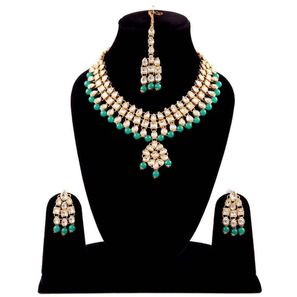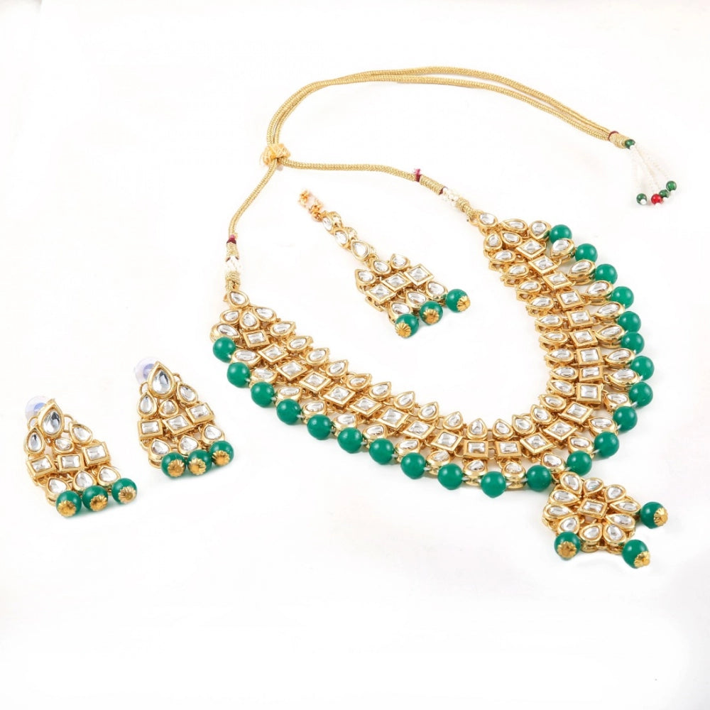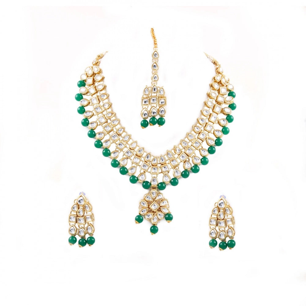 Fashion Green Beads Gold Plated Kundan Necklace Set For Women