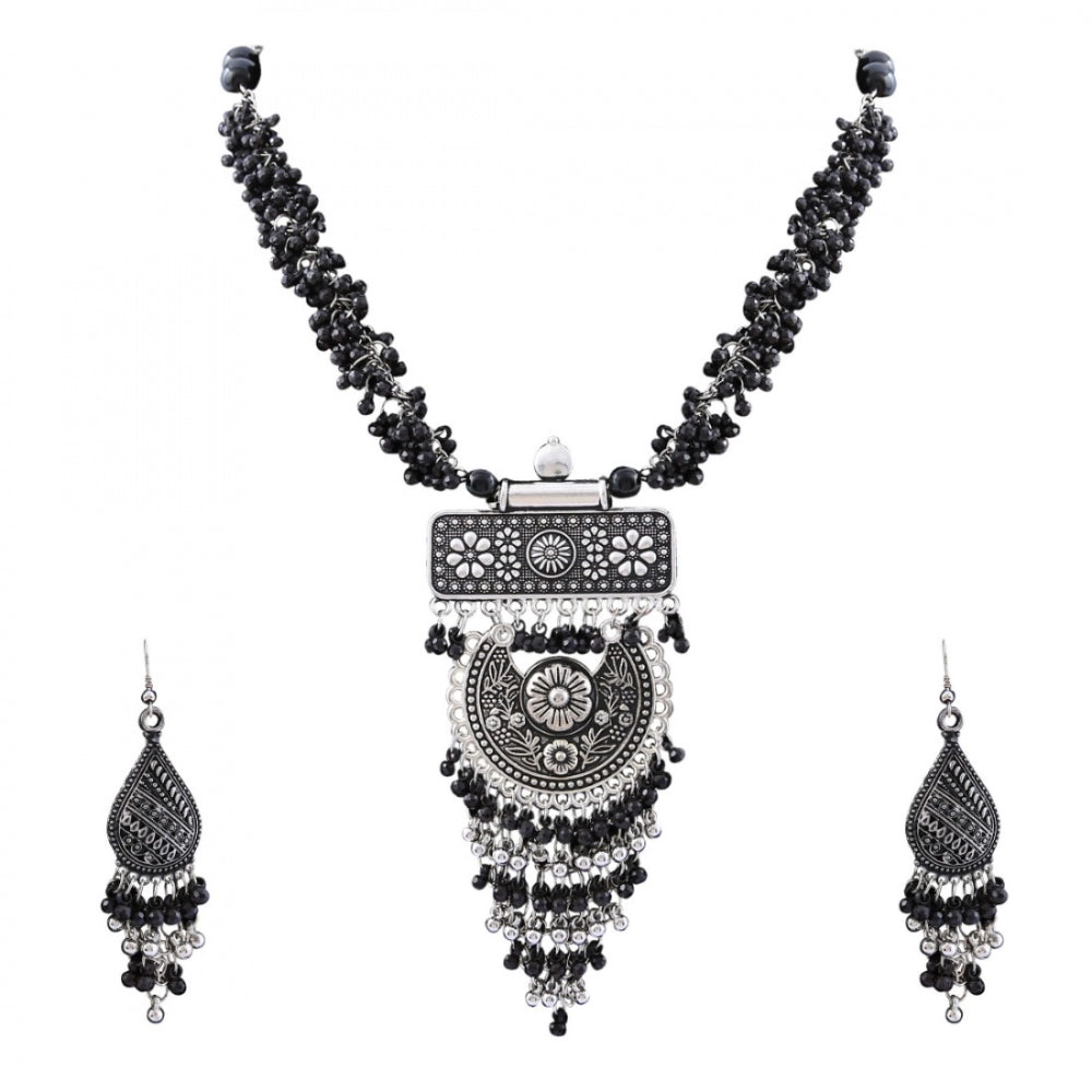 Fashion Silver Antique German Oxidized Silver Plated Tribal Afghani Necklace With Earrings Set For Women
