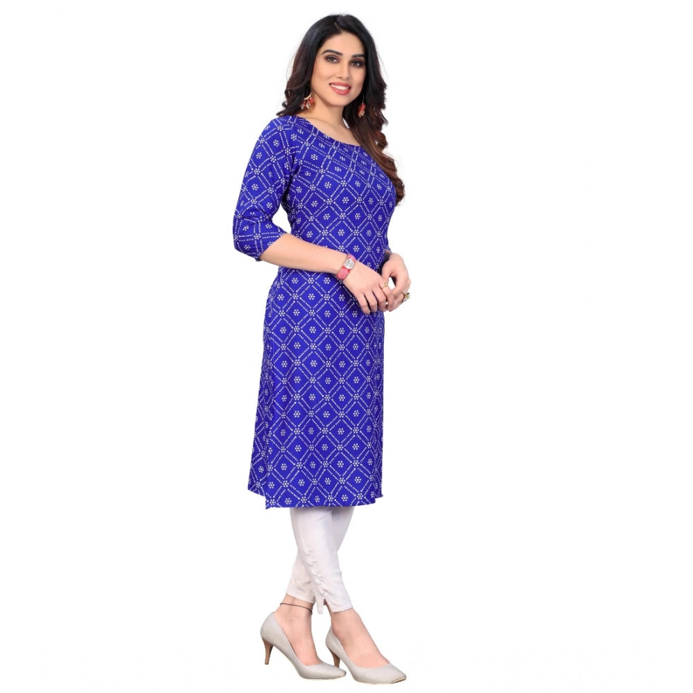 Women's Casual 3/4th Sleeve Bandhani Printed Crepe Kurti, • Color: Blue, • Material: Crepe, • Pattern: Bandhani Printed, • Kurti Type: Straight, • Kurti Length Type: Knee Length, • Neck Type: Round Neck, • Sleeve Length: 3/4 Sleeve, • Gender: Women, • Disclaimer: The color of actual product may vary slightly from the images provided due to photographic lighting conditions and difference in screen resolutions.