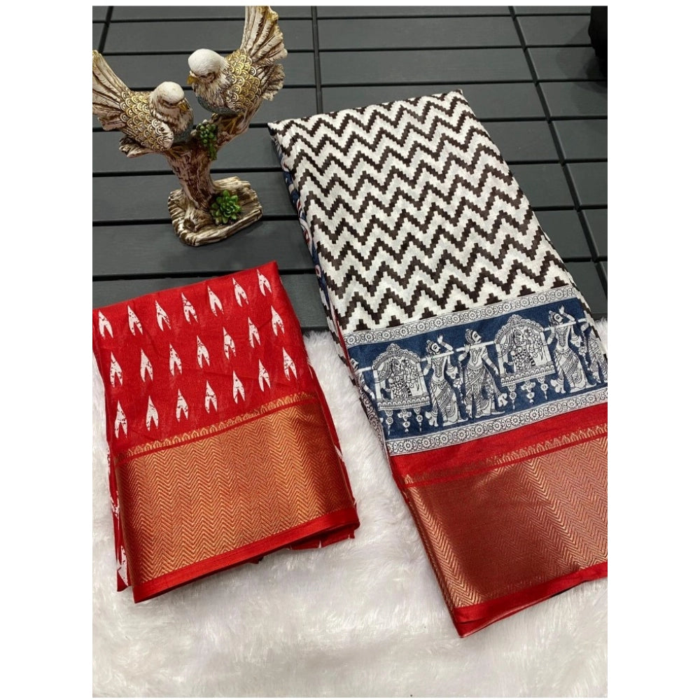 Amfyn Women's Soft Dola Cotton Kalamkari Printed Saree With Unstitched Blouse 5.5Mtr (Red)